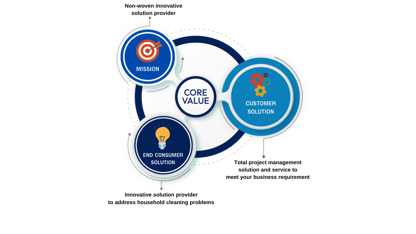 พันธกิจของเรา คือการก้าวสู่การเป็นบริษัทผู้คิดค้นคำตอบที่มีนวัตกรรมใหม่ๆแก่ลูกค้าและผู้บริโภค ซึ่งมุ่งมั่นพัฒนาศักยภาพอย่างต่อเนื่อง เพื่อรักษามาตรฐานและนวัตกรรมในอุตสาหกรรมที่เกี่ยวกับผ้านอนวูฟเวนสำหรับทั้งตลาดในประเทศและตลาดโลก